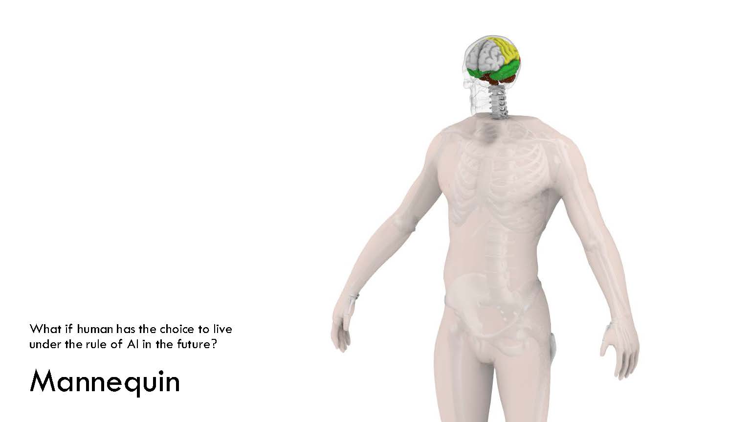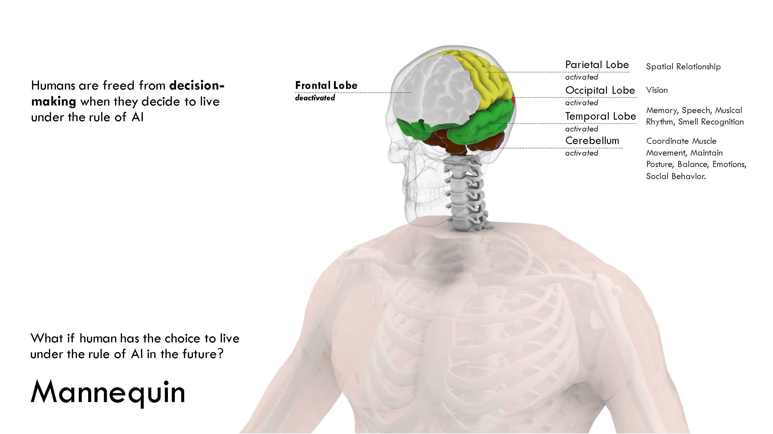 Visualize a human mannequin symbolizing this concept, emphasizing the deactivation of the frontal lobe—the decision-making hub—in the brain. The transparent appearance signifies freedom from decision-making, akin to following AI's lead.
