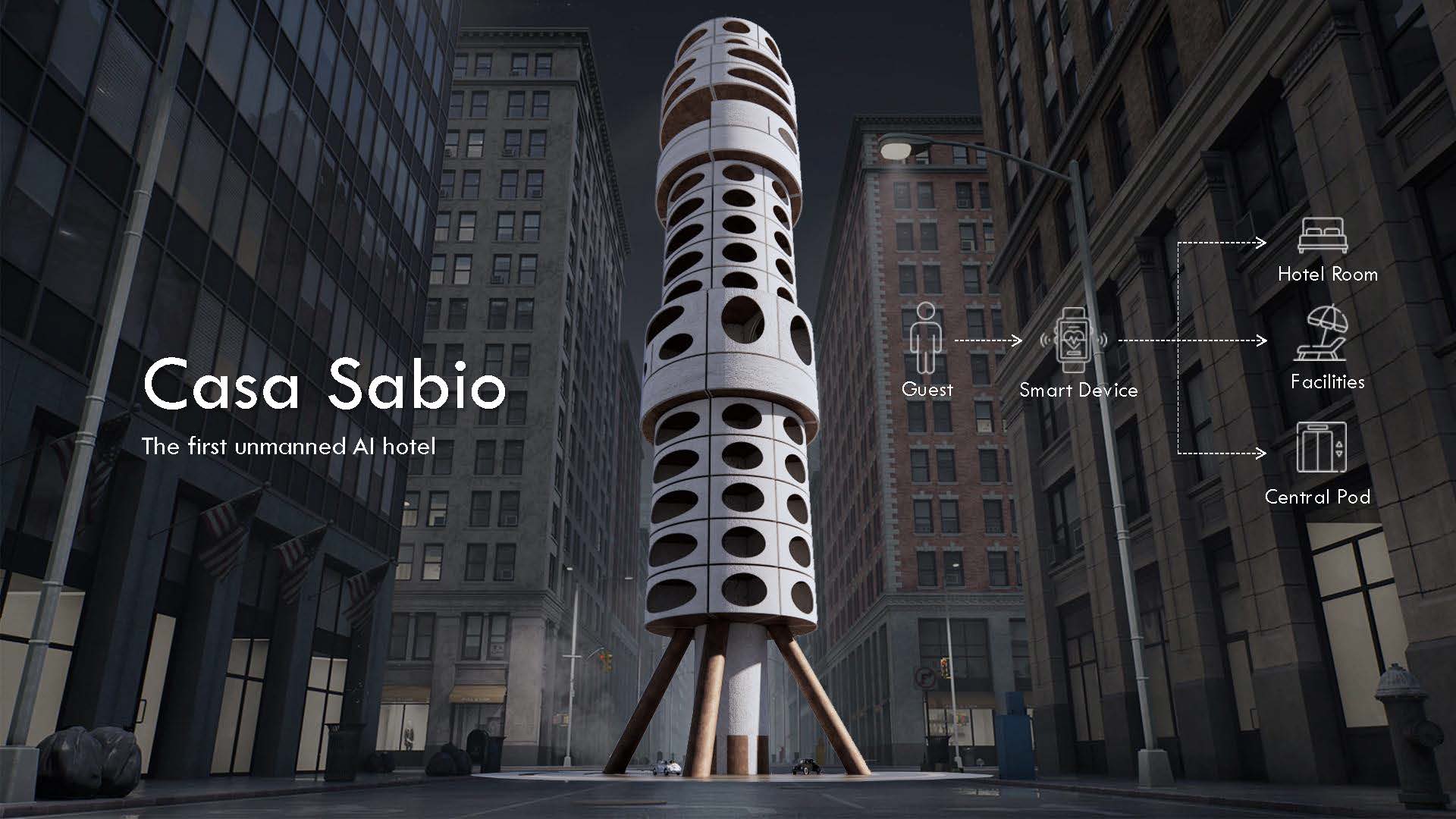 This speculation leads us to envision the future of vacations through architecture. Enter Casa Sabio, the inaugural unmanned AI hotel embodying the essence of staycations guided by AI decisions. Here, novelty and the unexpected become the norm, offering a glimpse into a future where human experiences are curated by artificial intelligence.