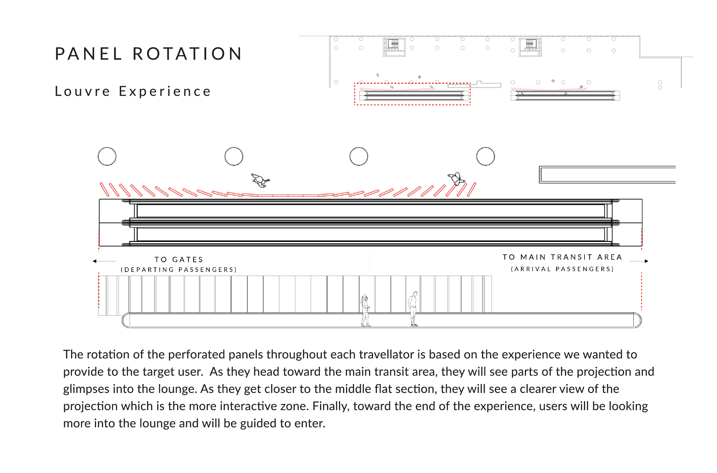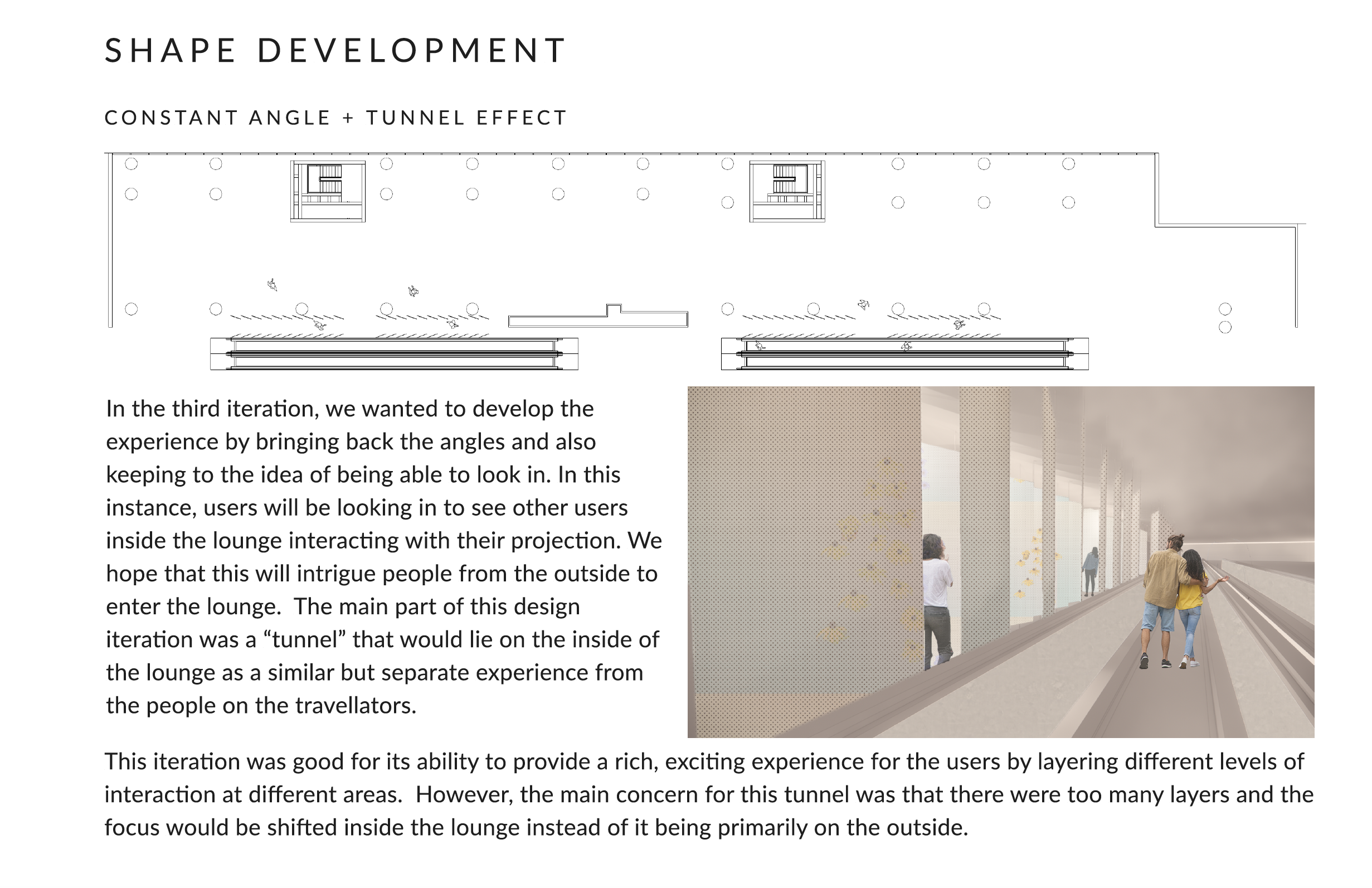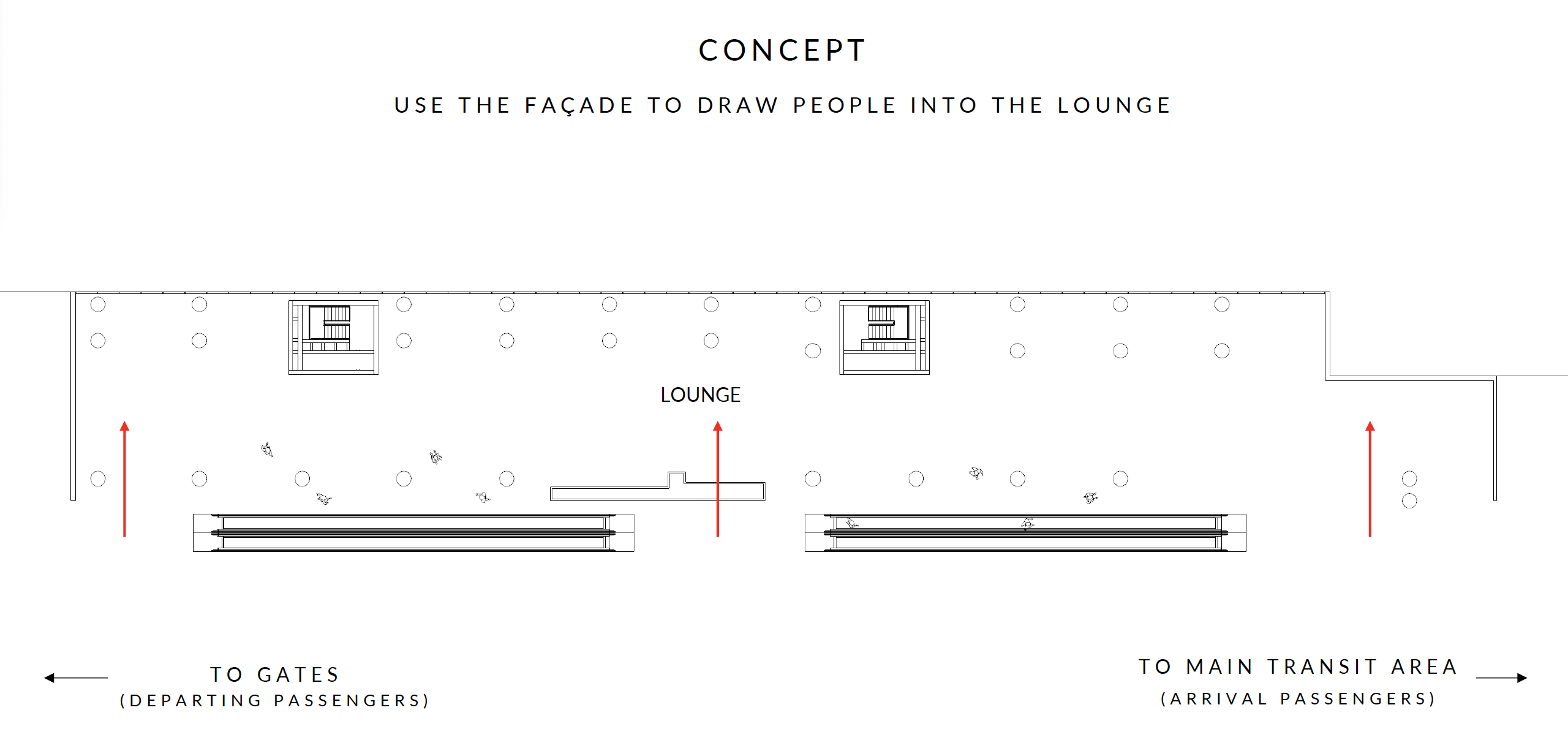 Passersby on the outside of the facade along the escalator, drawn by the animated spectacle, would be compelled to investigate the source of the enchantment within the lounge. This ingenious design would not only welcome arriving passengers but also actively engaged and beckoned them to join the vibrant atmosphere within.