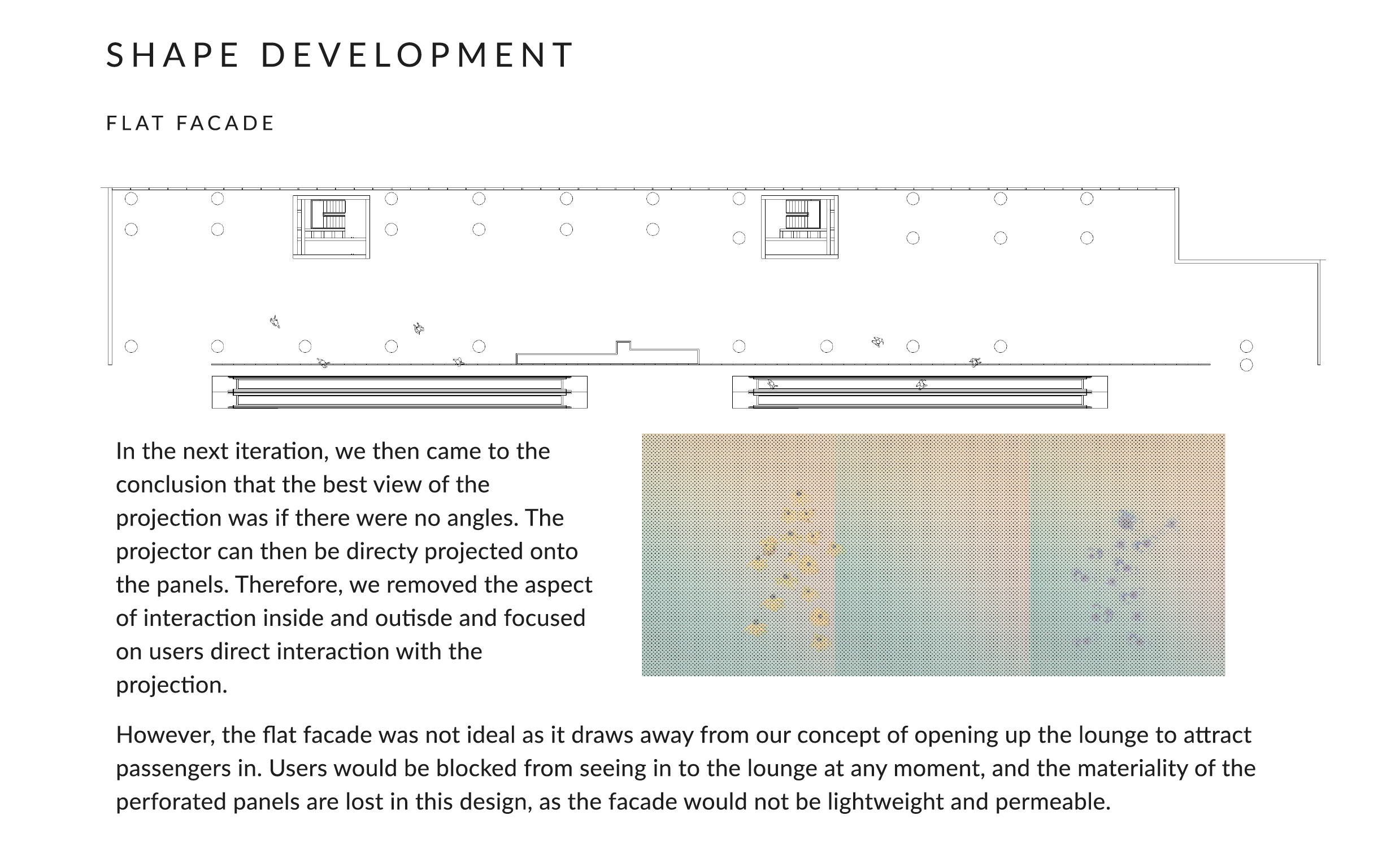 At the heart of our group's visionary endeavor lay the concept of crafting an engaging and immersive experience for arriving passengers. The focal point: a meticulously designed screen constructed from repurposed perforated ceiling panels. This architectural marvel served as a captivating beacon, enticing and intriguing those making their way into the Terminal 2 waiting lounge.
