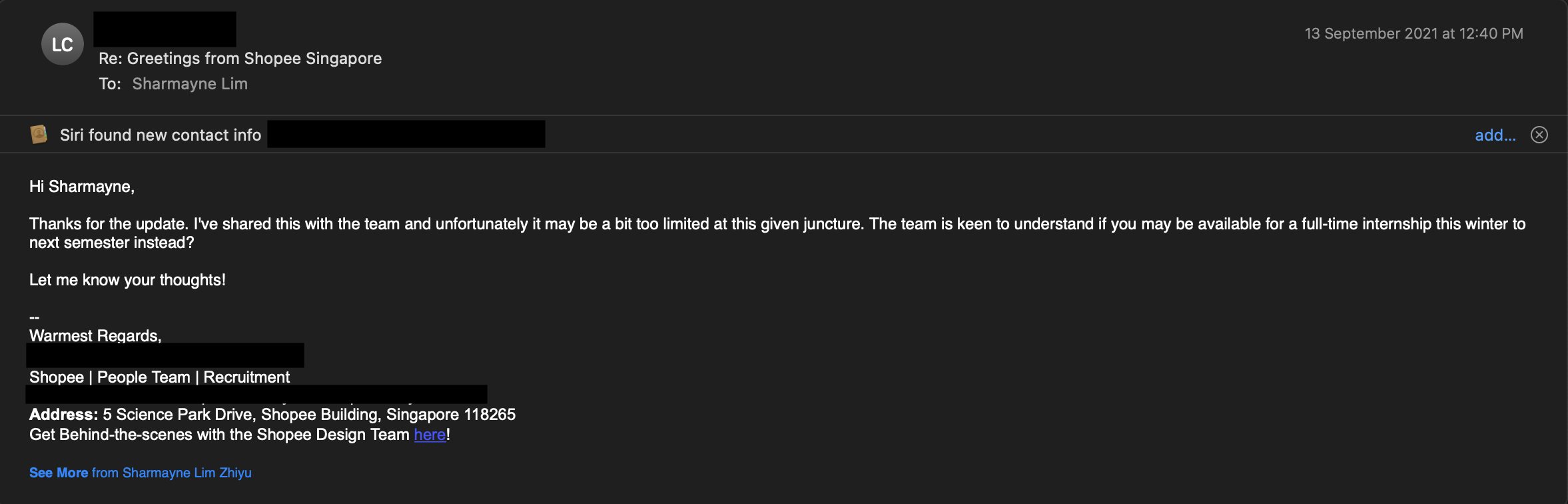 After this design test, there was another interview to talk to the team that I would be joining and then I was offered the position! However, due to the inflexibility of my school timetable, the time I was able to commit to the internship was not sufficient, hence they kept the offer open and gave me the option to get back to them the next time I was keen and had more time :)