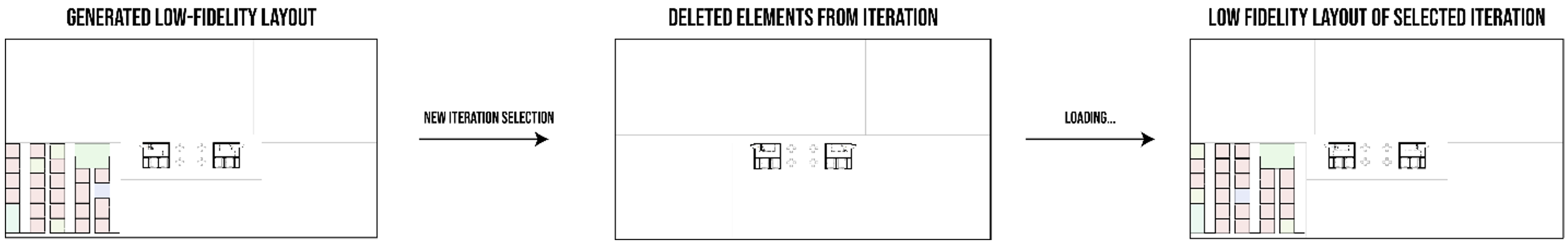 Low Fidelity Options: The approaches to create temporary elements for the selection of each design iteration did not work well due to the factors mentioned above. The team had to work around this issue and continue providing users the ability to select different layouts while being able to pan around within the Revit interface to inspect the layout with comfort. From our user testing feedback, designers also preferred to see a simple low-fidelity layout which easily portrays the circulation and space distribution of the layout. The approach to this issue and user wants was to create permanent Revit elements in low-fidelity layout (without furniture) which shows a simple version of the layout with colour coding for the different types of spaces within the floor plan. As the layouts produced were low fidelity, it was quick to generate them multiple times. The plugin collected the necessary information on the elements created for each iteration, placed the elements in their positions when an iteration ID is called upon and delete them to create space upon selection of another iteration. The final desired selection could then be converted into a high-fidelity version. This flow, as shown in Figure 11, allows users to inspect different iterations relatively quickly while allowing them to generate a high-fidelity version of the layout if needed.