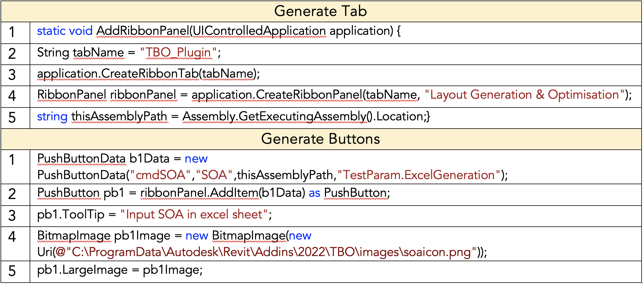 User Input: BestFit uses C# to interact with the Revit API for creating the application and executing commands within Revit. For the prompting of users to input the required data, the plugin employs modal windows forms whenever a button from the TBO_Plugin tab is clicked. Figure 13 shows the different buttons for users to click in the TBO_Plugin ribbon and Figure 14 shows the code used for generating the tab (blue) and the buttons (red).