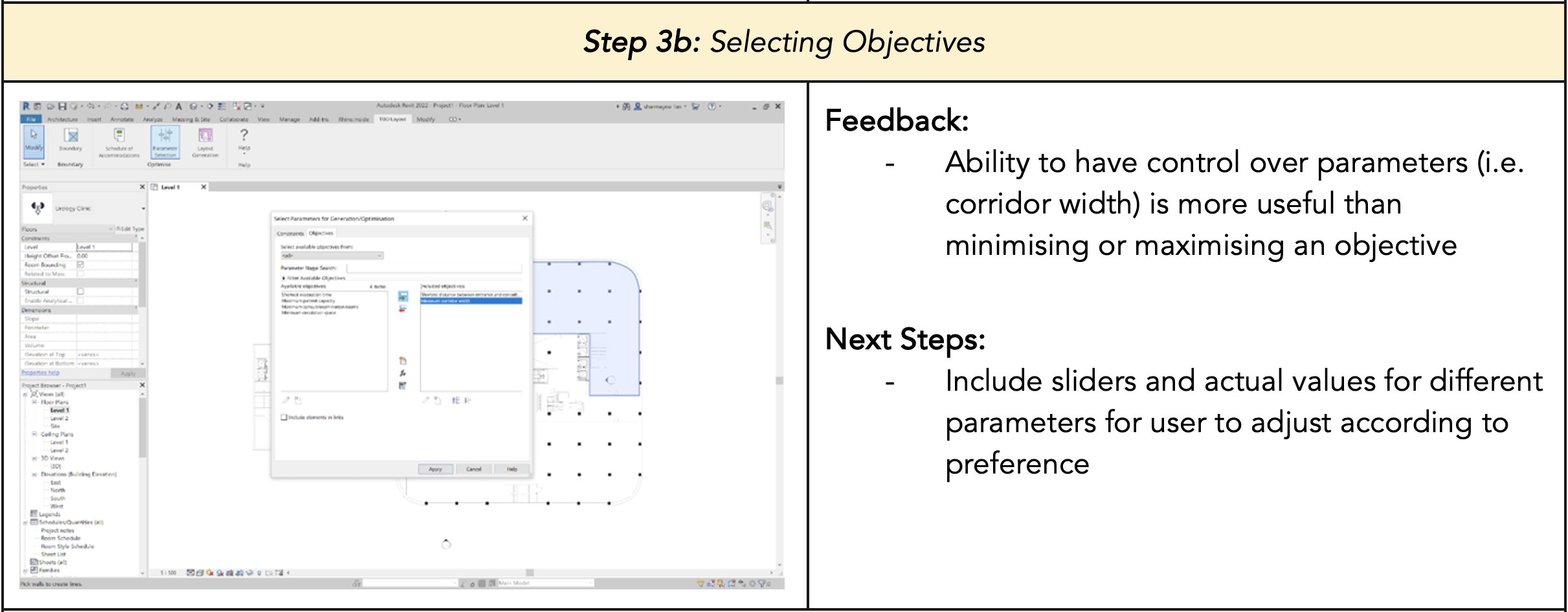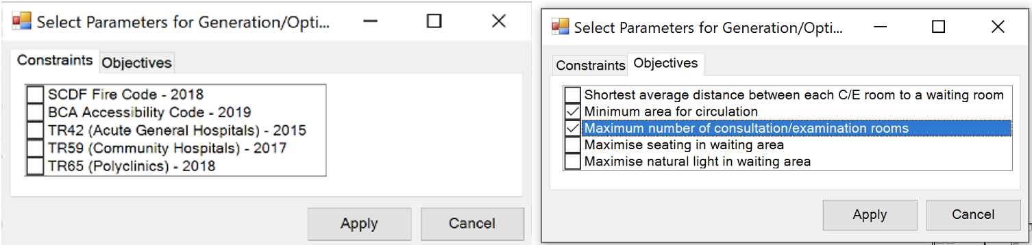 Selecting Parameters and Objectives: Next, users can select parameters such as constraints and objectives to inform the generation of the layout options. Figure 22 shows examples of the constraints and objectives we have on our plugin. Constraints include authority guidelines that the designs need to adhere to, and the objectives include minimizing or maximizing the distance between two points or the number of rooms.
