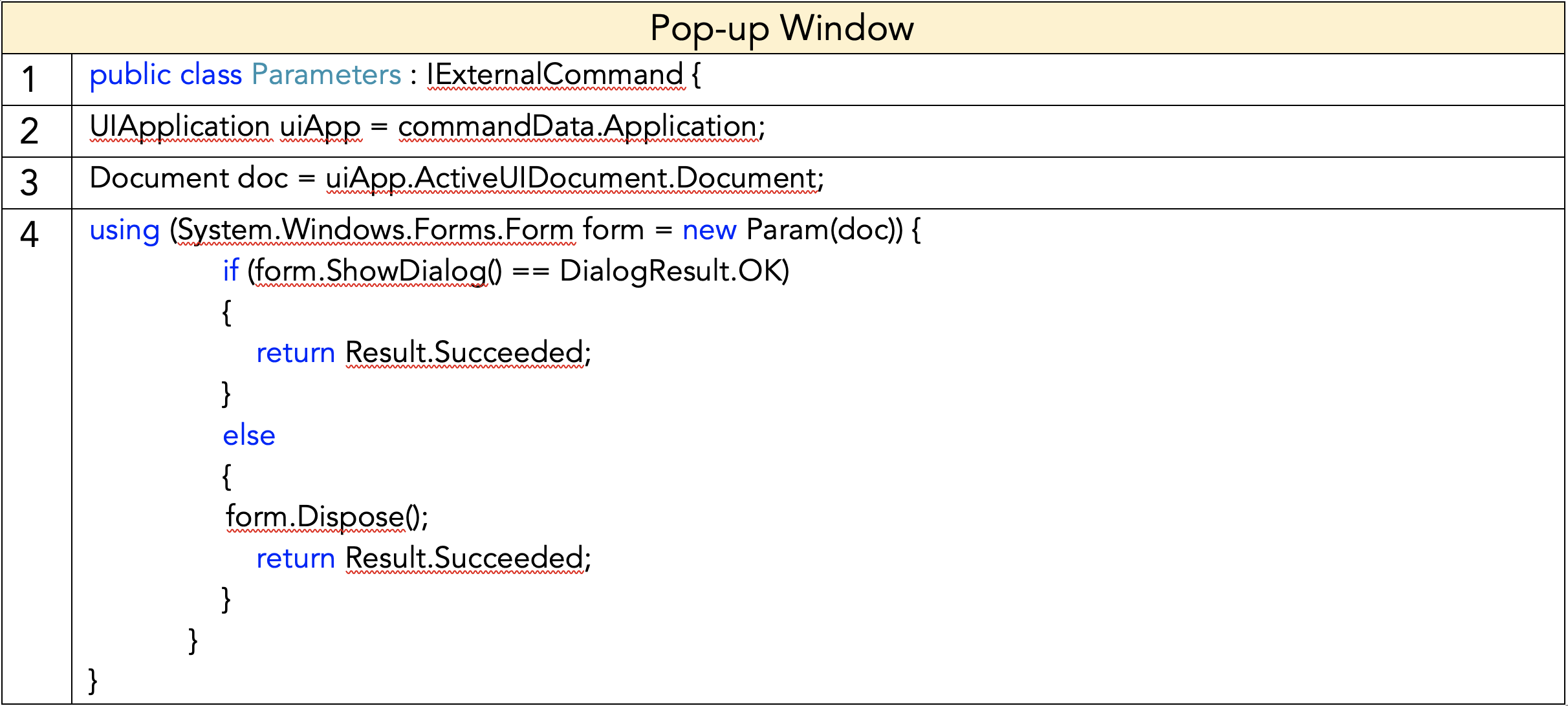 Figure 15 shows an example of a windows modal form which is employed when users are required to input data which is necessary for the next steps of the plugin. The IExternalCommand class from Revit API is used to execute the command for windows to pop up when interacting with Revit. Figure 16 shows the general code to create pop-up windows.