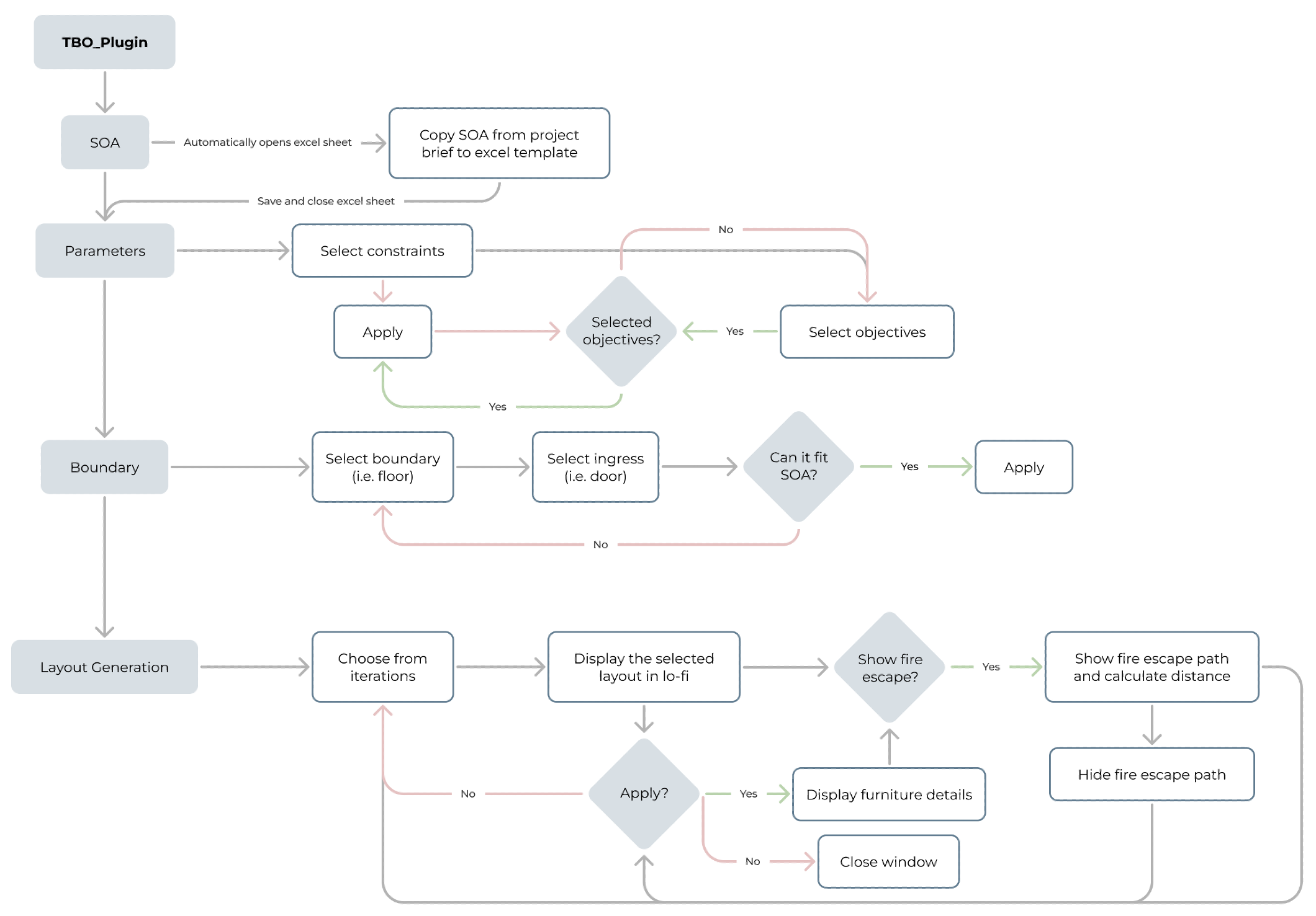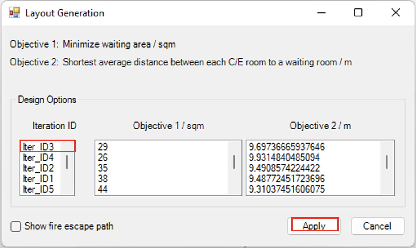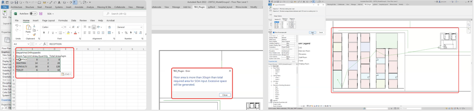 Moreover, they can simply copy and paste the schedule of accommodations from their project brief into an excel sheet template that will be automatically opened up when they click on the SOA button in Revit (Figure 27, left). Next, when users select a boundary that is too small or large based on the schedule of accommodations they have indicated, there would either be a warning (Figure 27, middle) indicating how much excess space would be generated or an error requesting for users to select a larger boundary if not they will not be able to proceed with the generation. Furthermore, users are able to enjoy a shorter waiting time for the generation of different layout options as the plugin shows the layouts in low-fidelity first (Figure 27, right), and only reveals the details within the layout after the users have selected a particular layout that they are satisfied with. At the last step, users will also be able to see the corresponding objective function values for each of the layout options they are presented with. Lastly, for each of these layout options, there is also an option for users to automatically generate the fire escape path and distance for each layout option they select (Figure 27, right).