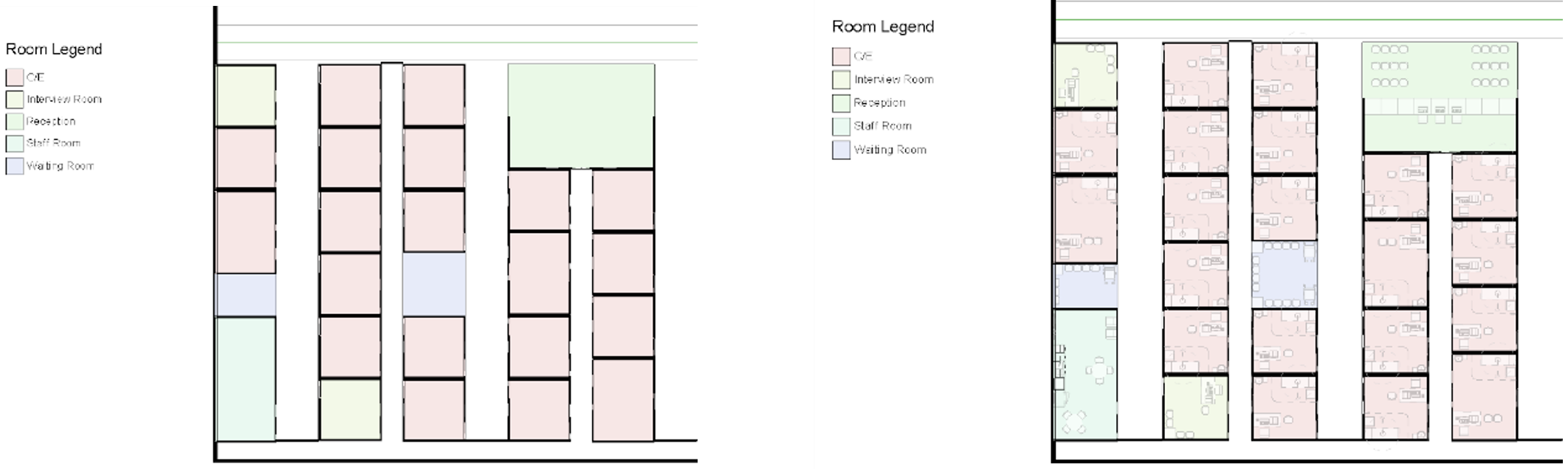 As for the constraints, the main constraint we considered at this stage was to ensure that all clusters placed in the grid are connected to at least two other clusters adjacent to it in order to make sure it is possible to navigate the whole space by starting from one specific point. We should also make sure that all user specified parameters such as the number of consultation rooms, number of toilets, number of waiting areas are being met.