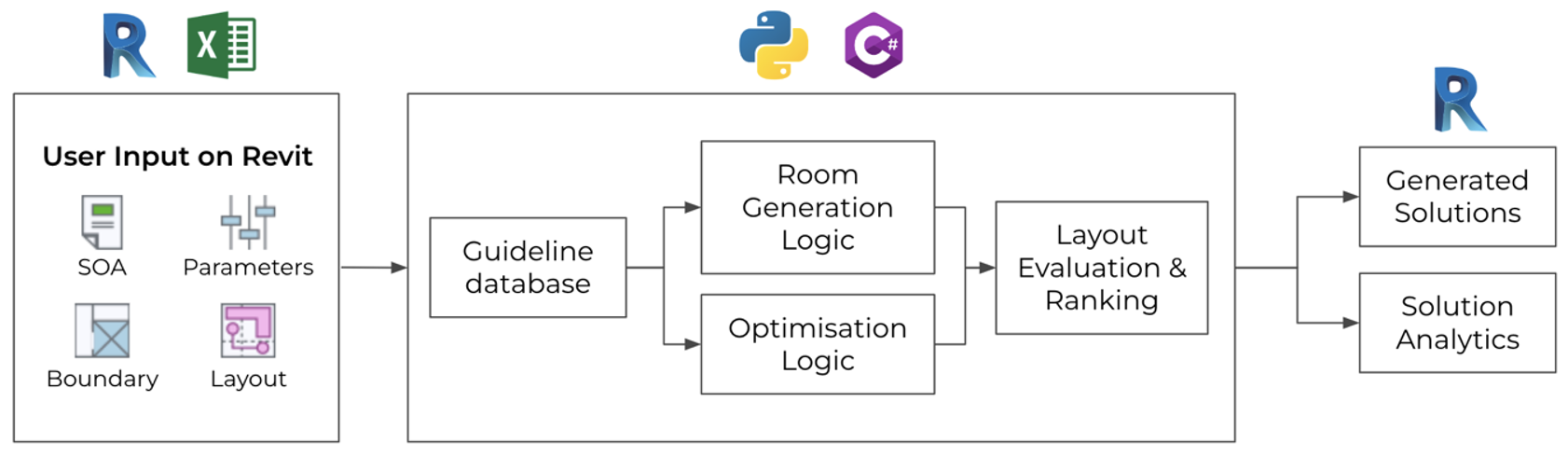 Our plugin’s architecture comprises three main parts as seen in Figure 2. Firstly, user inputs on Revit are taken in and stored in excel files to feed to the backend code. Next the backend code in the form of Python libraries will take in contextual information from the excel files for the room generation and optimization algorithms to generate, evaluate and rank the different solution. Lastly, the best few design outputs according to the evaluation of the Python libraries will be ranked and shown to the users on Revit for their selection.