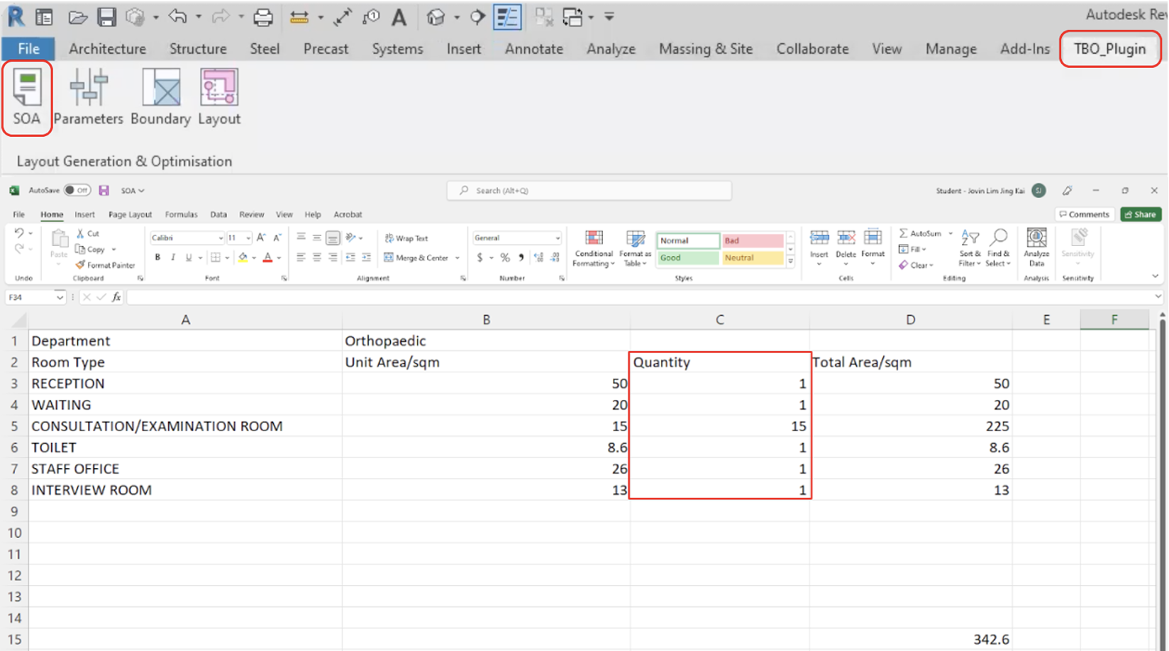 Input SOA: When users click on SOA, it would automatically instantiate an excel sheet with a template with key headers such as the room type, area, and quantity as seen in Figure 21. Users can simply key in the number of rooms and it would automatically compute the total area of the individual type of rooms. After users save and close the excel, this information would be stored by the plugin.
