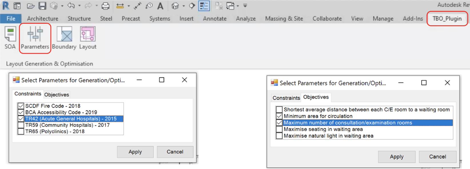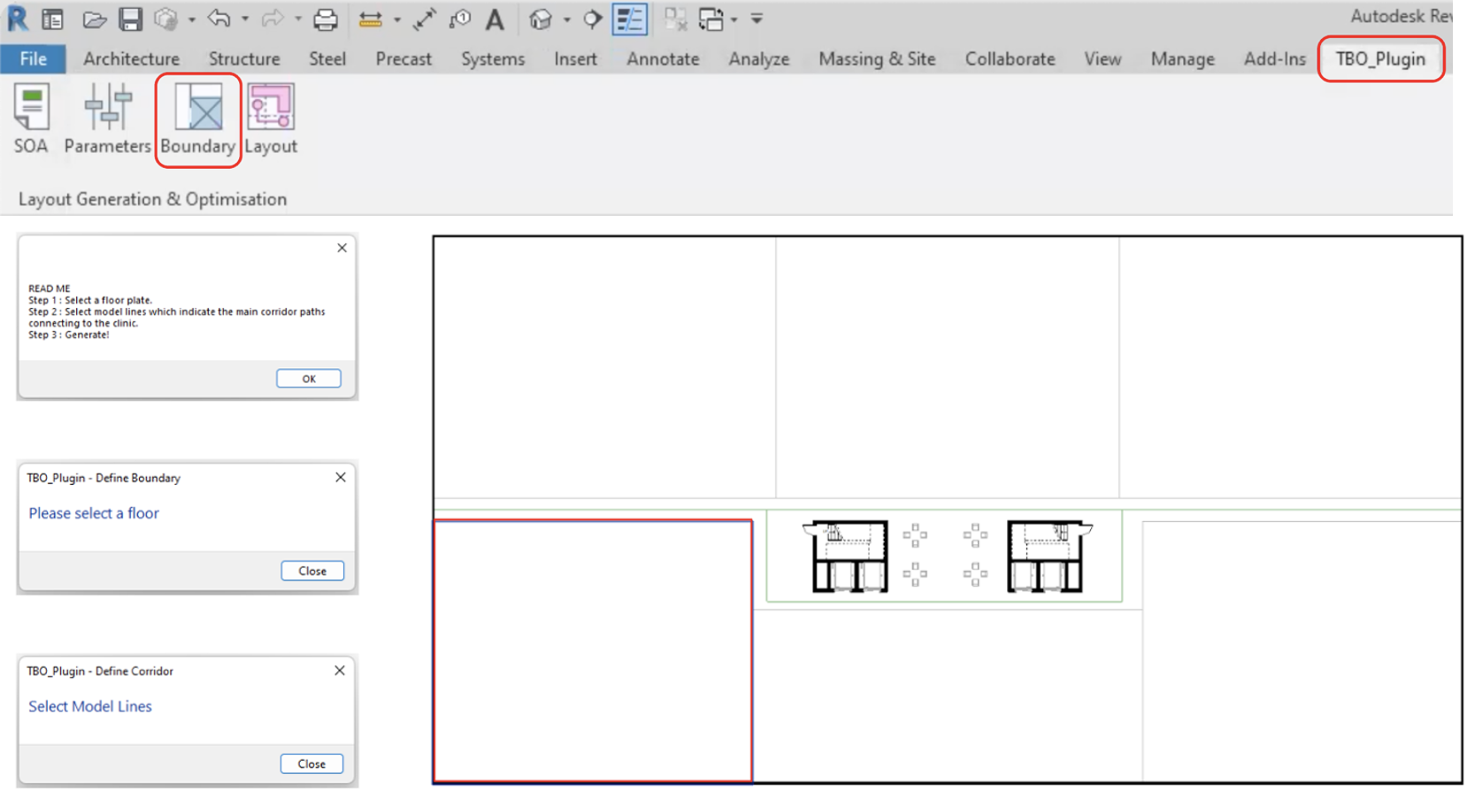 Our plugin is integrated into the Revit platform as we have found out through market research that our users, healthcare architects, are mandated to use Revit for their design submissions. After downloading and installing our plugin, users will be able to access it on the Revit workspace. As seen in Figure 3, with just four simple steps – SOA, Parameters, Boundary and Layout Generation – users will be able to automatically generate several optimized layouts to choose from.