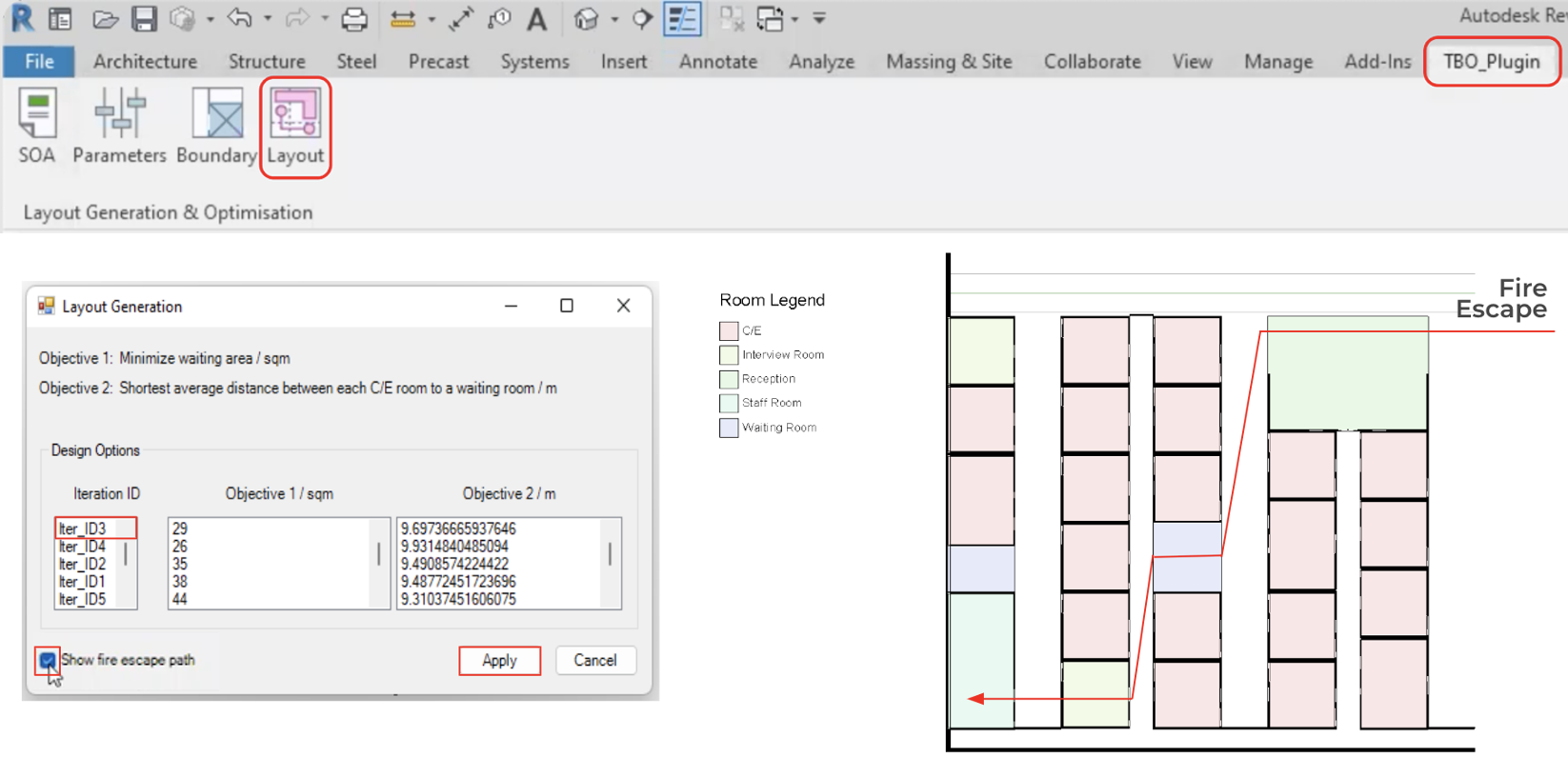 Layout Generation: The last component of our plugin is the layout generation. When users click on layout, a dialog box (Figure 24, left) will appear showing the various layout options as well as the corresponding objective function values. Users can feel free to click on any of the options to try them out and each time, a low-fidelity layout (Figure 24, right) will appear upon clicking. Users can also automatically calculate and generate the distance from the furthest room to the fire escape within the layout option to make more informed decision when selecting the layout options. When they are finally satisfied with an option, they can proceed to click apply, and a high-fidelity layout would then appear.
