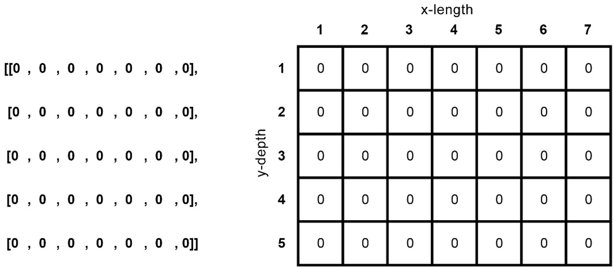 A nested list called ‘m_id’ is created as a global variable which can be accessed and edited with the subsequent functions. The index of the parent list represents the y-depth values while the element of the child list will represent the x-length values. The matrix values can be accessed through the y-x-coordinate of the nested list.