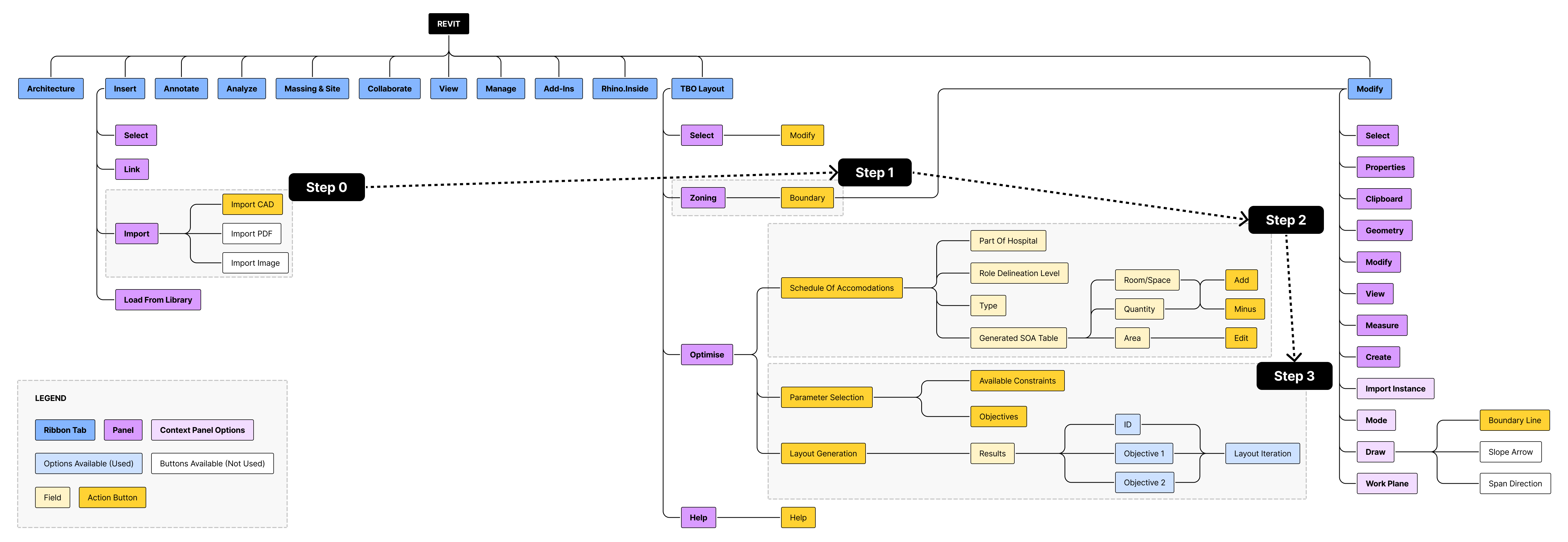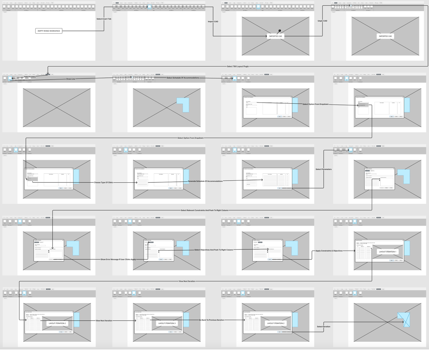This is an overview of our information architecture, with three key steps to use the plugin. Step 1 was for users to define the boundary, step 2 for them to identify the boundary and input the schedule of accommodations, and step 3 for them to select constraints and objectives to automatically generate many optimised layouts. After charting out the system and information architecture of our product, we proceeded to design low-fidelity wireframes as seen in Figure 5 to map out the steps of how users would use our product.
