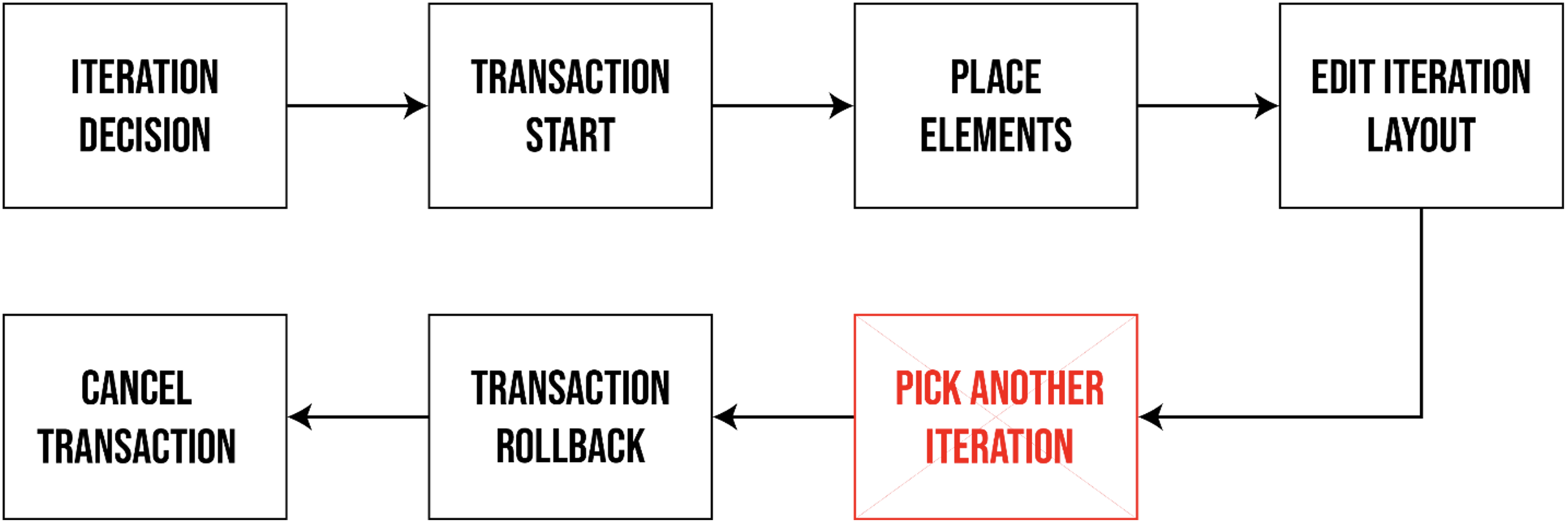 Transition rollbacks can be used to reverse the steps of generation for certain elements. Typically, a transaction must be started using the Revit API to generate elements and these transactions must be committed for the elements to become permanent and remain on the interface. One visualisation option that the team tested was to use transaction rollbacks when users are selecting between the different layouts generated by BestFit. Figure 7 shows the general flow of using transaction rollbacks for output visualization.