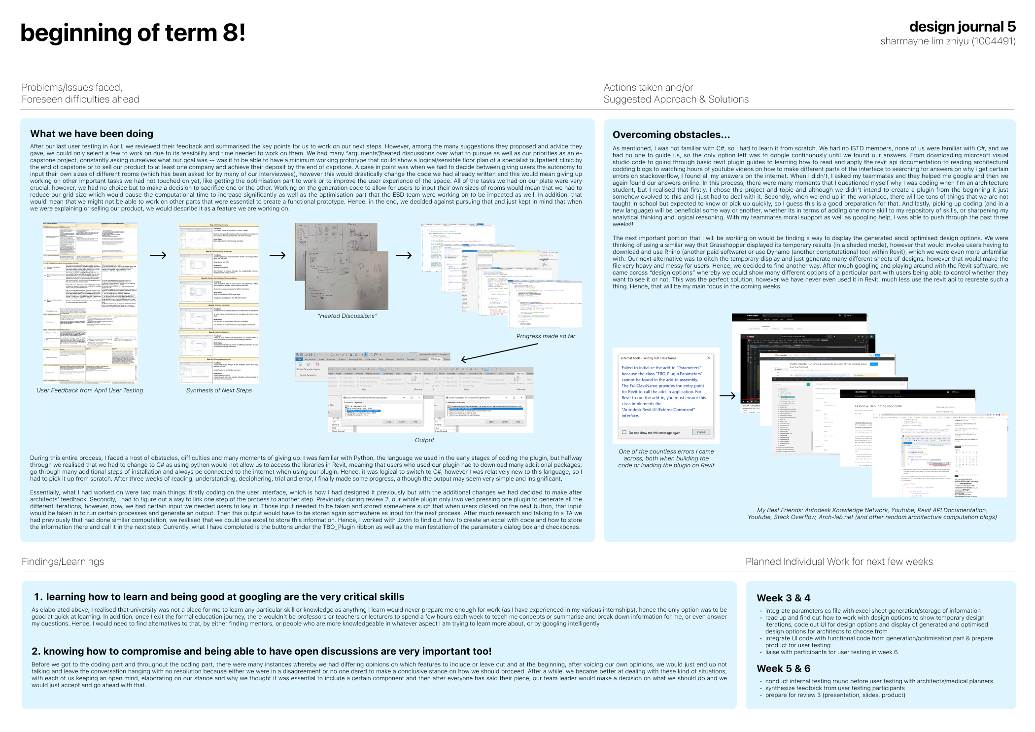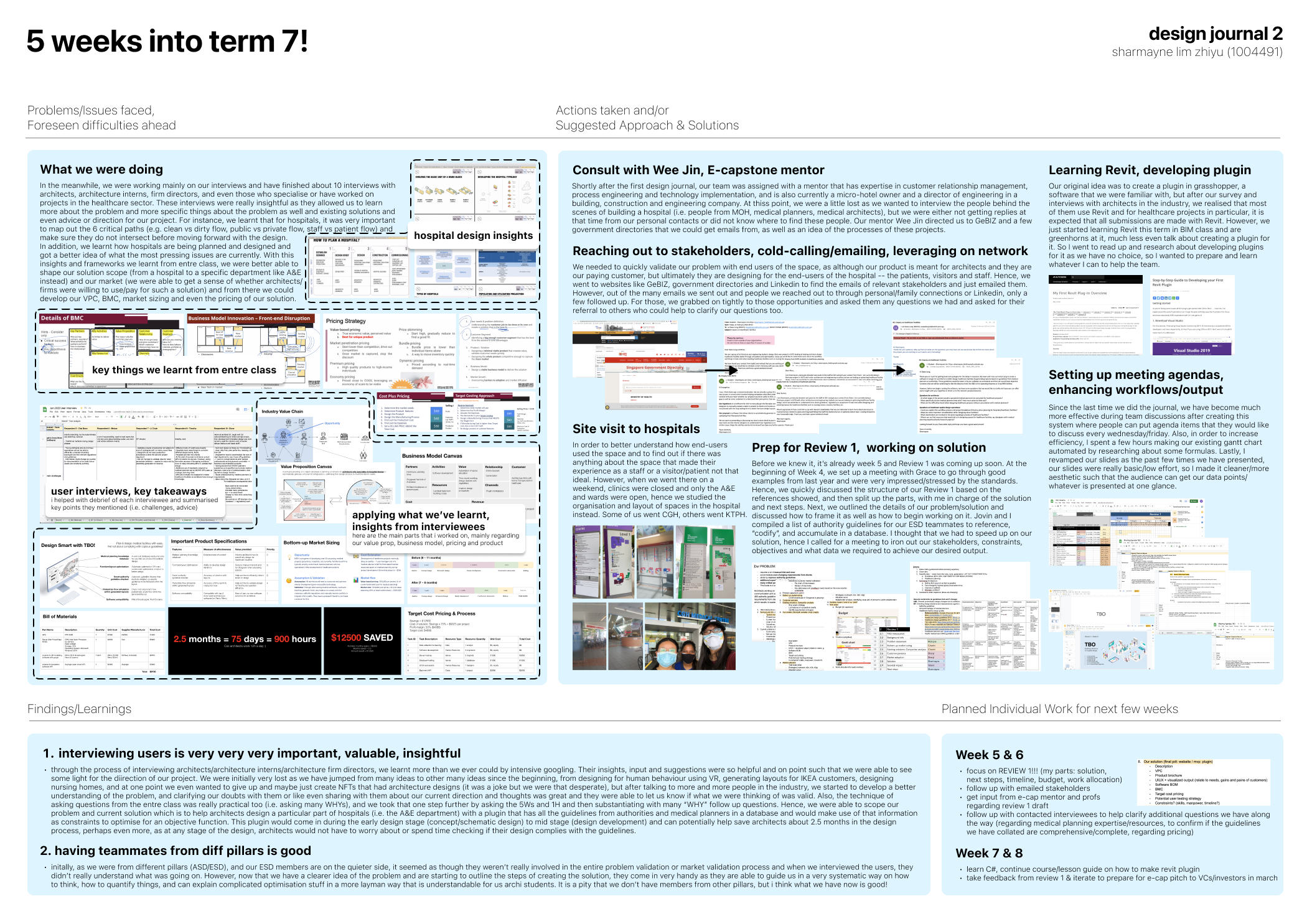 Before the design and development of our solution, we worked on market and user research, interviewing individuals and stakeholders such as architects, medical planners and facilities management staff from hospitals to find out more about the problems they face and how the project can add value to their routines and organisation. From the research and interviews, we were able to accurately pinpoint the target group of customers and beachhead market and understand the customers’ needs and constraints. Information from the interviews and feedback from customers aided our team’s design decision-making process, validated the different features for the product and helped us decide when to make necessary changes. With the information, we came up with a design of our product – a Revit plugin that automatically generates and optimises floor plan layouts for Specialist Outpatient Clinics.