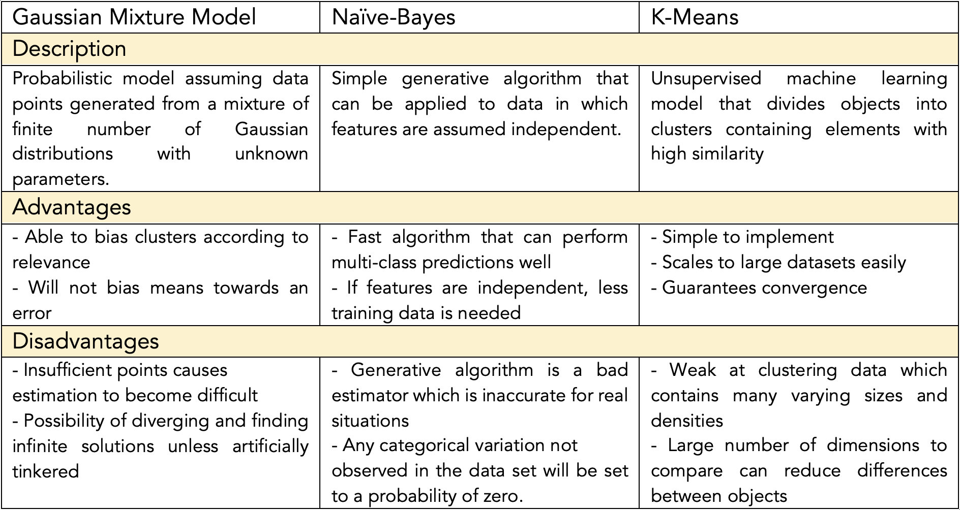 Machine Learning: Many generative models utilise machine learning to learn and generate better solutions. A common technique used in these models is clustering which allows data to be sorted based on different parameters and objectives. From the categorization of data, we can distinguish between solutions based on efficiency and continuously generate better results. The table below shows an analysis of some techniques used: