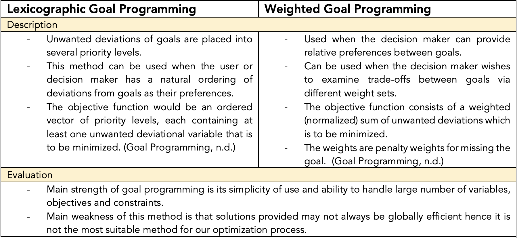 For optimization problems, a decision maker can express preferences such as numeric goals for the various objectives. The goal is to seek solutions that make as much progress as possible toward all objectives. Using goal programming methods converts each goal into at least one equality constraint and the objective would be to minimize deviations.