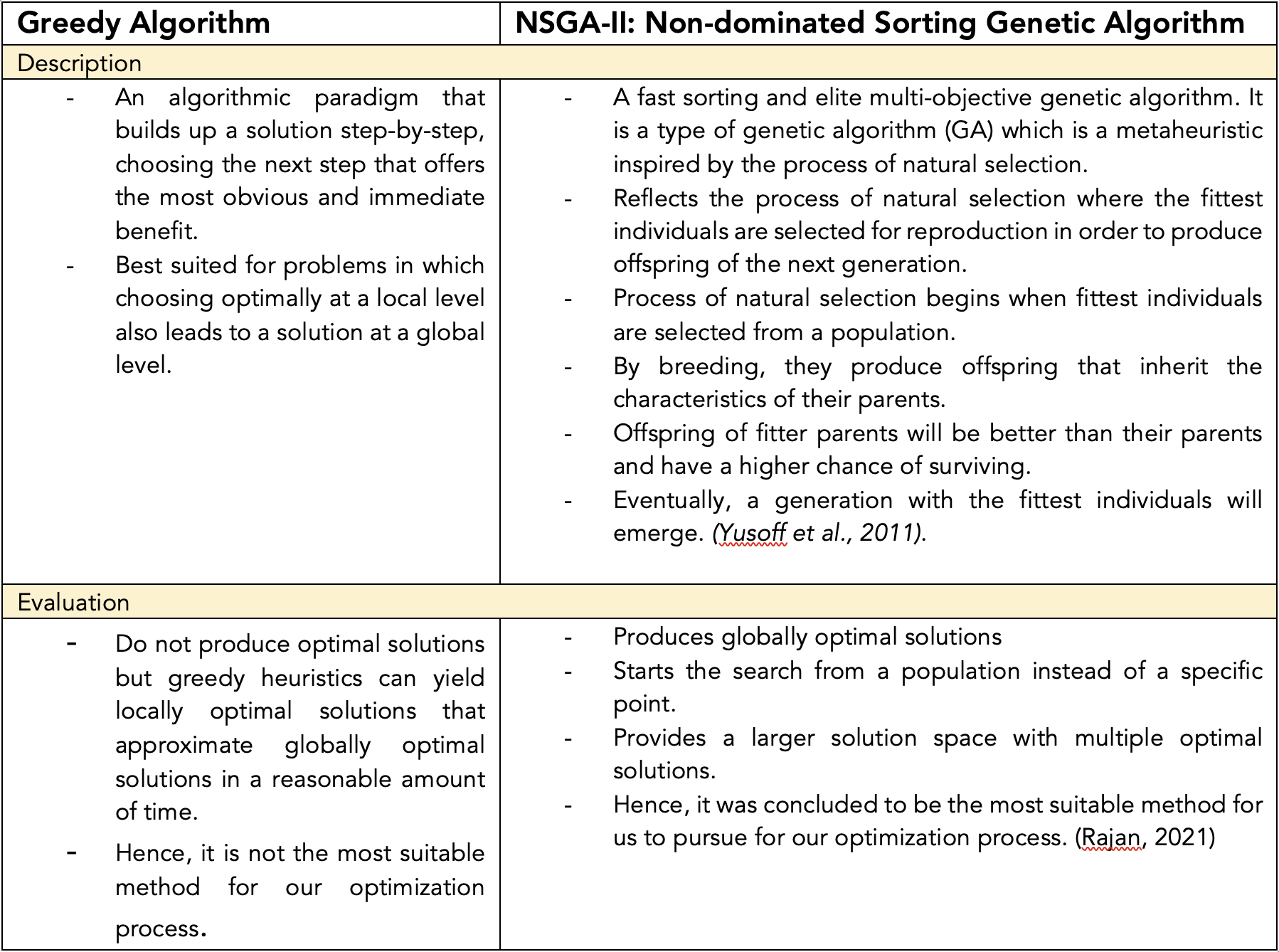 The NSGA-II algorithm will then proceed to select a random initial population which will be evaluated assigned a fitness based on the constraints and objectives that we have specified. The strongest feasible solutions are selected as the parent population which will then be crossed over and mutated in order to create an off-spring population. This process is repeated until the number of generations specified is met and the algorithm returns the most optimal and feasible solutions.