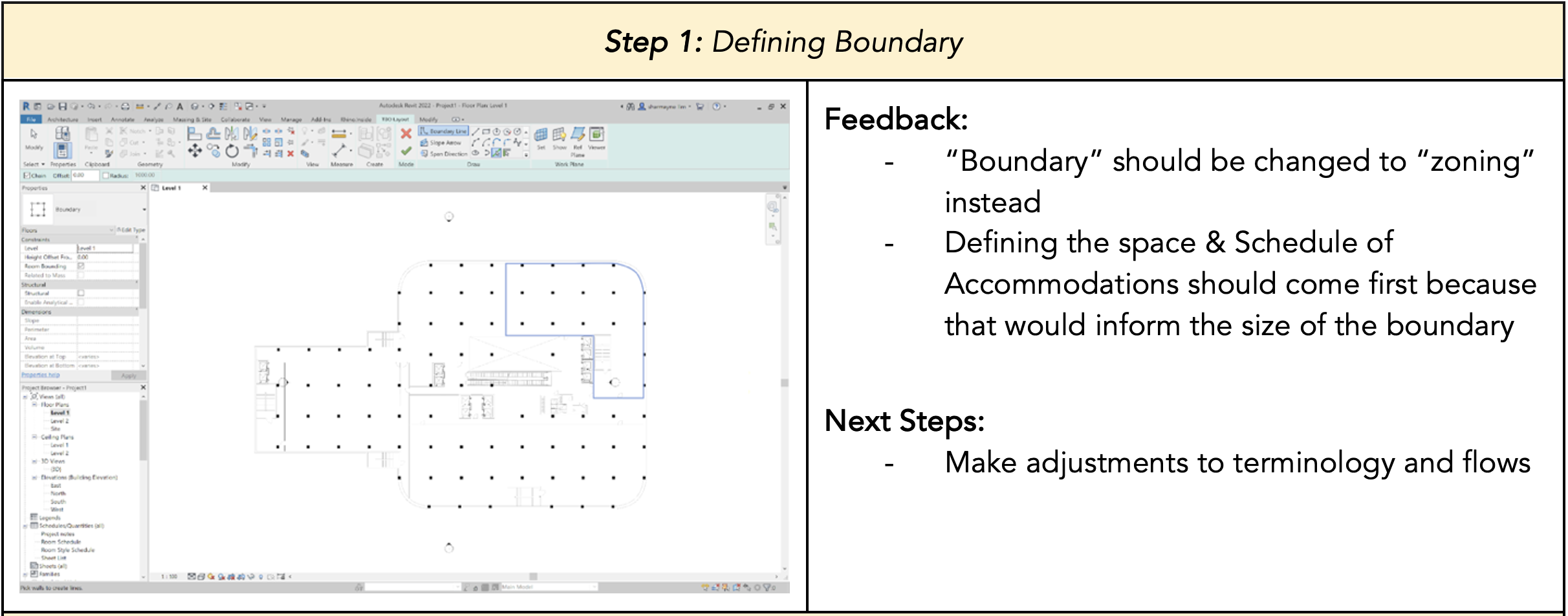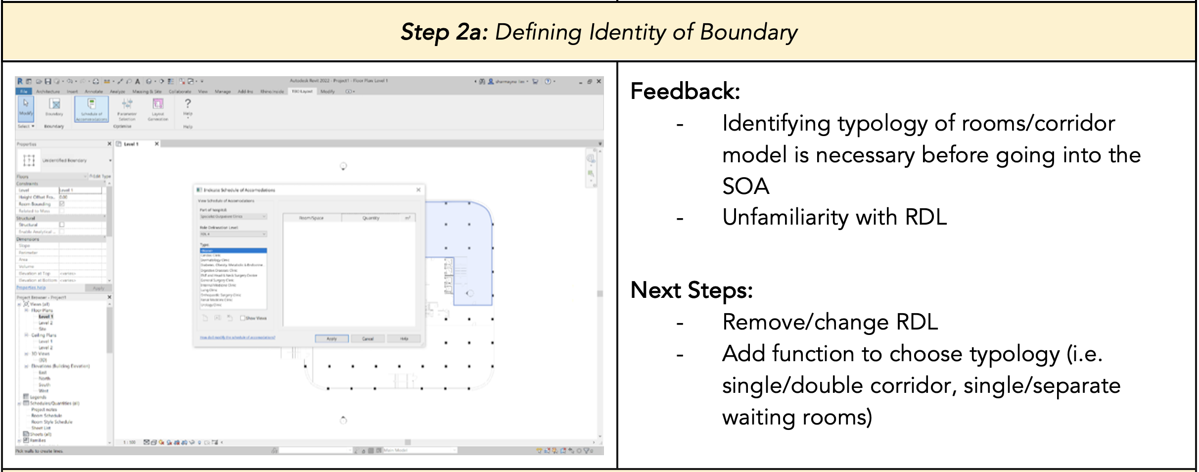 1. Making user flow more intuitive: Firstly, we needed to make slight adjustments to the workflow of the plugin as some parts of it was unintuitive for the users. We discovered that the architects found it more logical to determine the type and number of rooms according to the project brief they are given before drawing and choosing the boundary to design within. In addition, we needed to there were some terminologies that we used in our plugin (e.g. role delineation level which guides the schedule of accommodations for hospitals and clinics) that the architects were unfamiliar with as it was not commonly used in Singapore or that they found better alternatives for (e.g. zoning instead of boundary).
