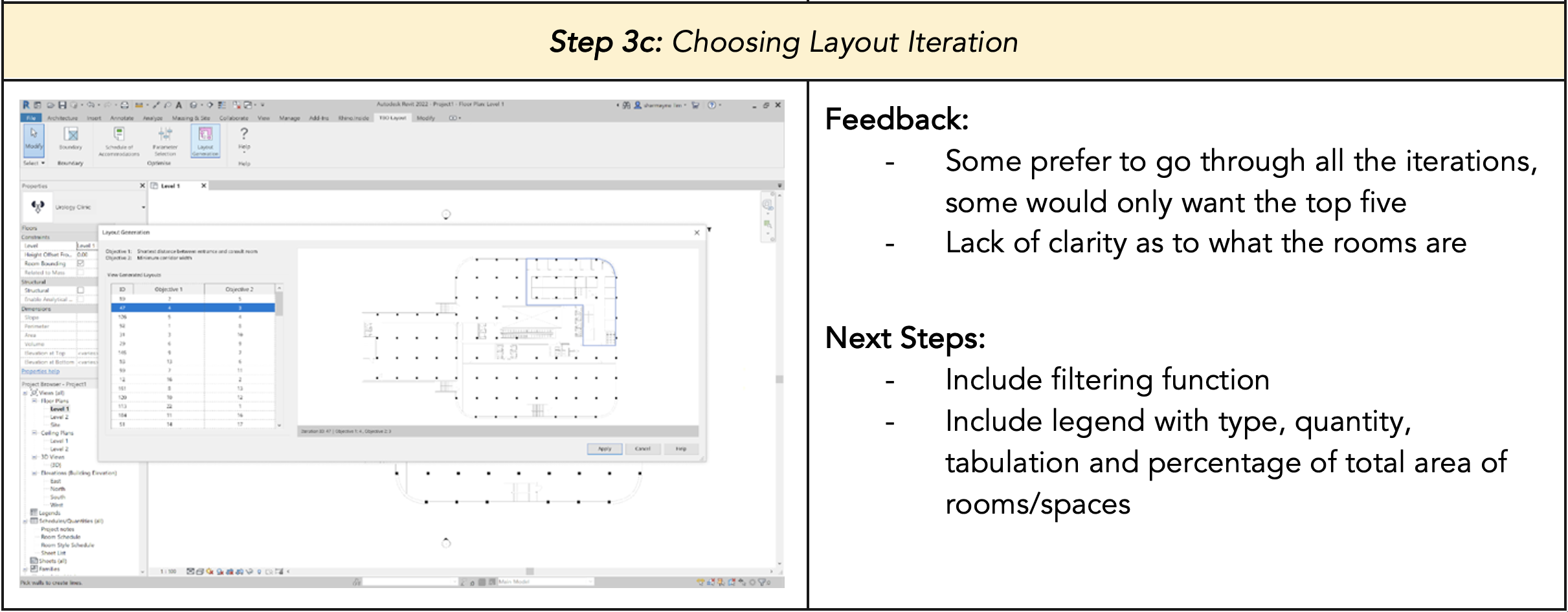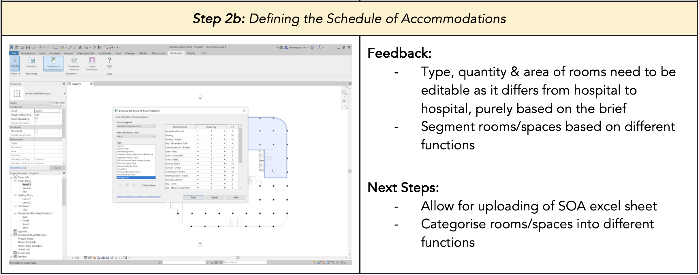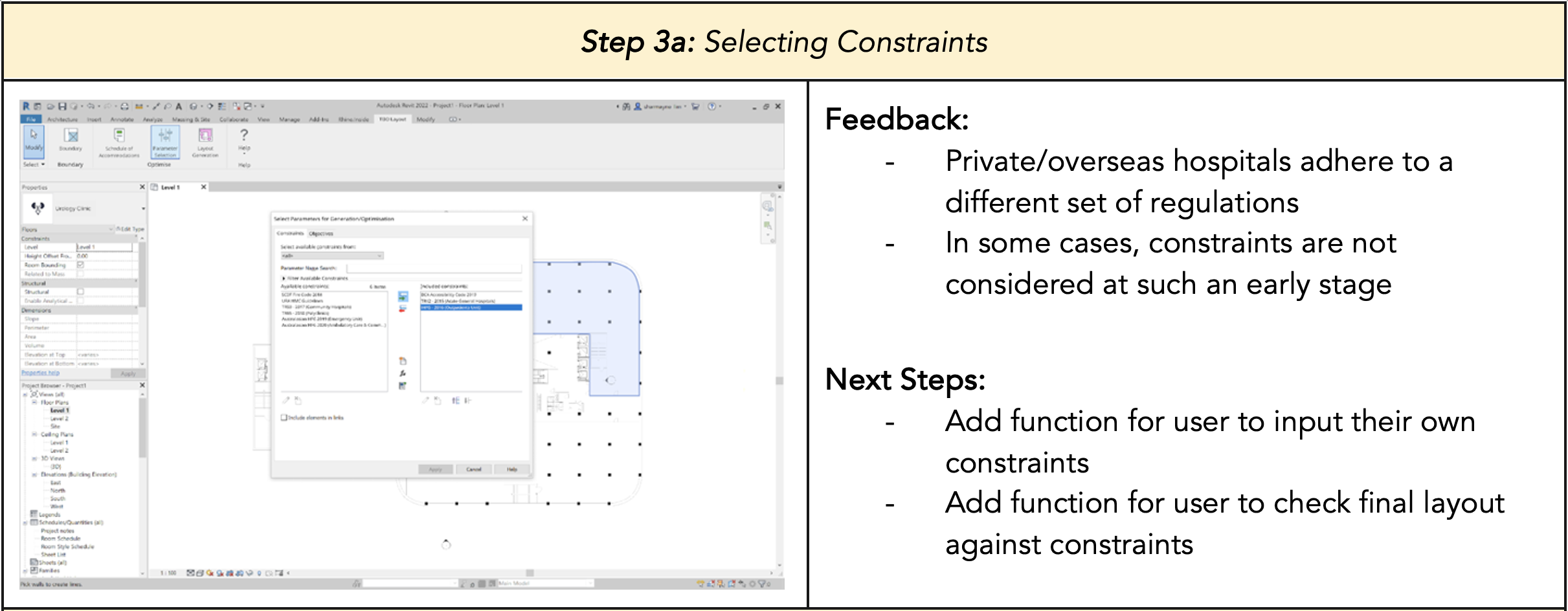Before translating the user interface into code and integrating it with the other components of the Revit plugin, we wanted to find out whether the flow was intuitive and discover how we can improve on the plugin’s design. Hence, we reached out to several healthcare architects and medical planners from varying companies and positions and conducted user testing sessions with them to get unbiased perspectives and comprehensive feedback for our plugin.