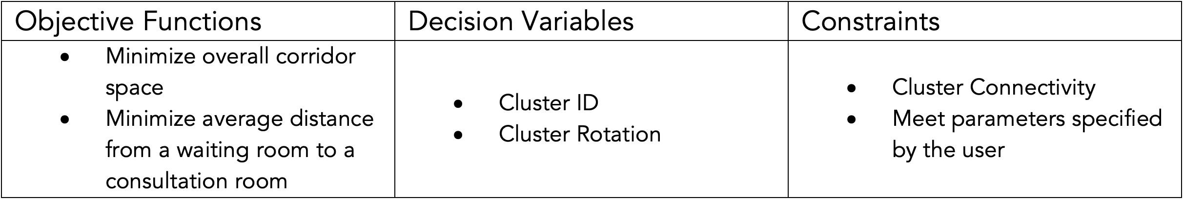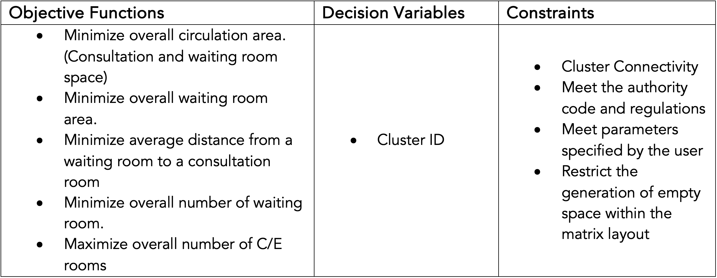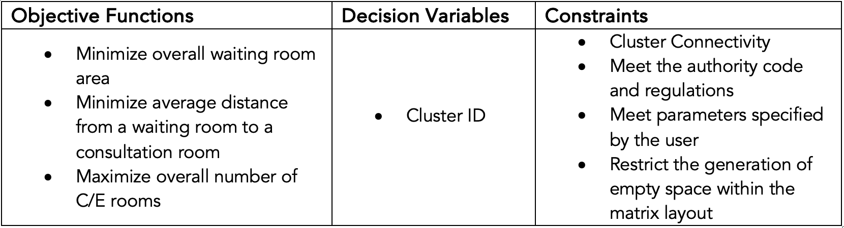 As for the constraints, through the generation and placement of the clusters we should always ensure that the clusters are connected to the circulation space that is pre-generated. We should also make sure that all user specified parameters such as the number of consultation rooms, number of toilets, number of waiting areas are being met. Finally, we should restrict the generation of empty space within each column to make sure that each column in the layout is filled with meaningful and functional clusters.