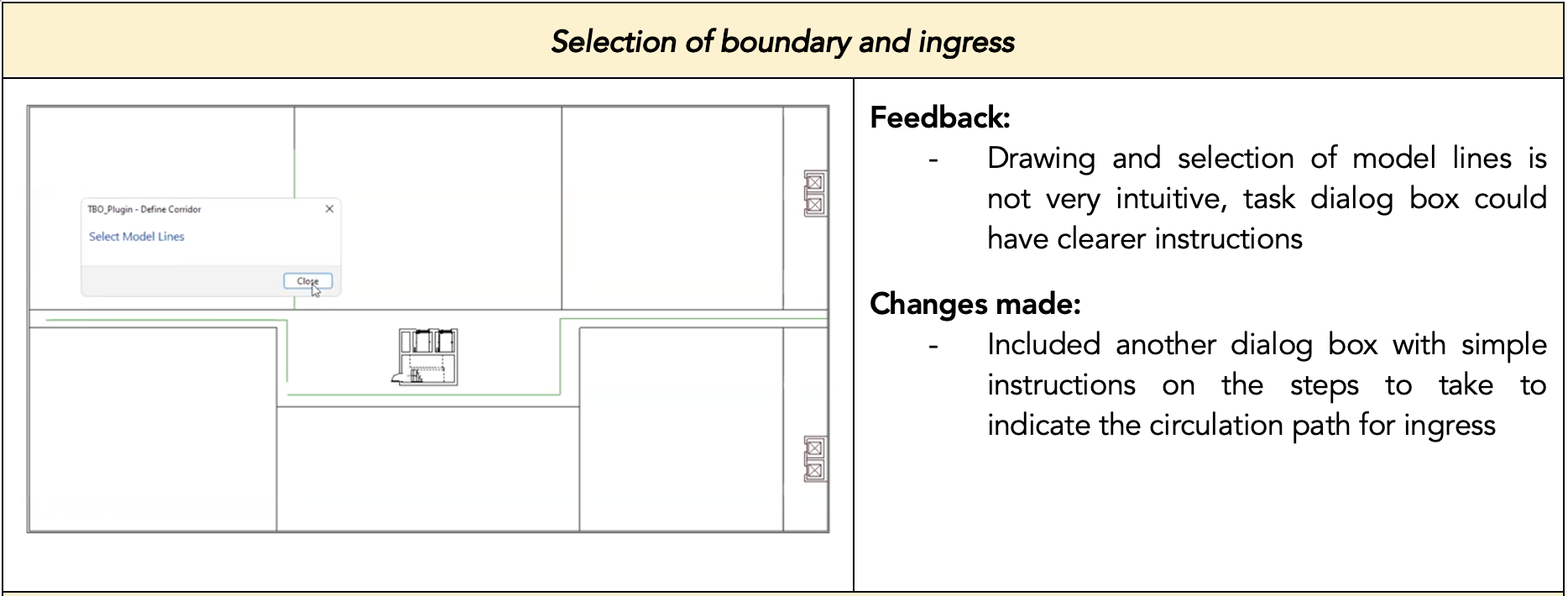 Boundary Input: Moving on, users can select the boundary that they would like to generate the layouts within as well as indicate the main path of circulation such that the plugin can identify the entrance of the boundary selected. To provide more guidance, a dialog box (Figure 23, top) with brief instruction will first appear to guide the user on the following steps such as selecting the floor and model lines which indicate the corridor adjacent to the boundary selected.