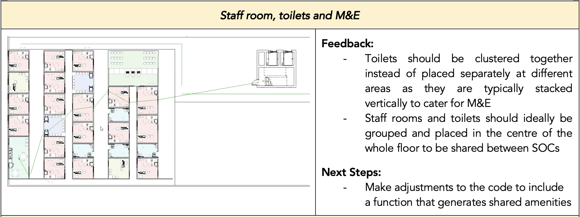 Due to time limitations, only the ‘comb’ typology was used due to the simple geometry the typology has, therefore the floor plate of the SOC must be rectilinear in geometry. The Generation Algorithm also does not consider existing or predetermined rooms such as toilet stack and stairwell.