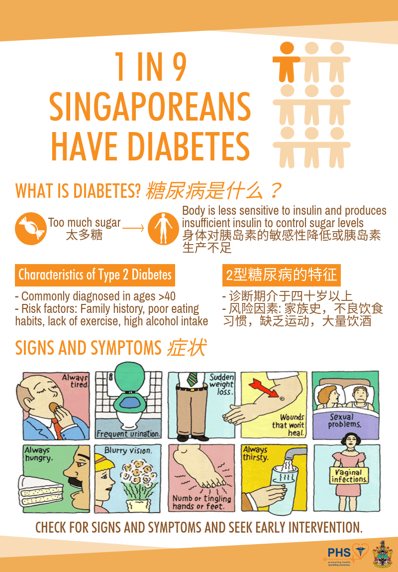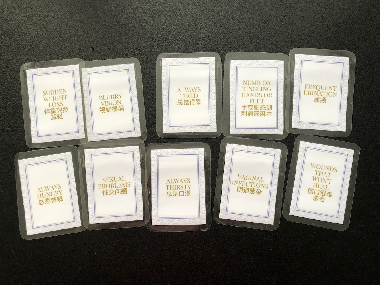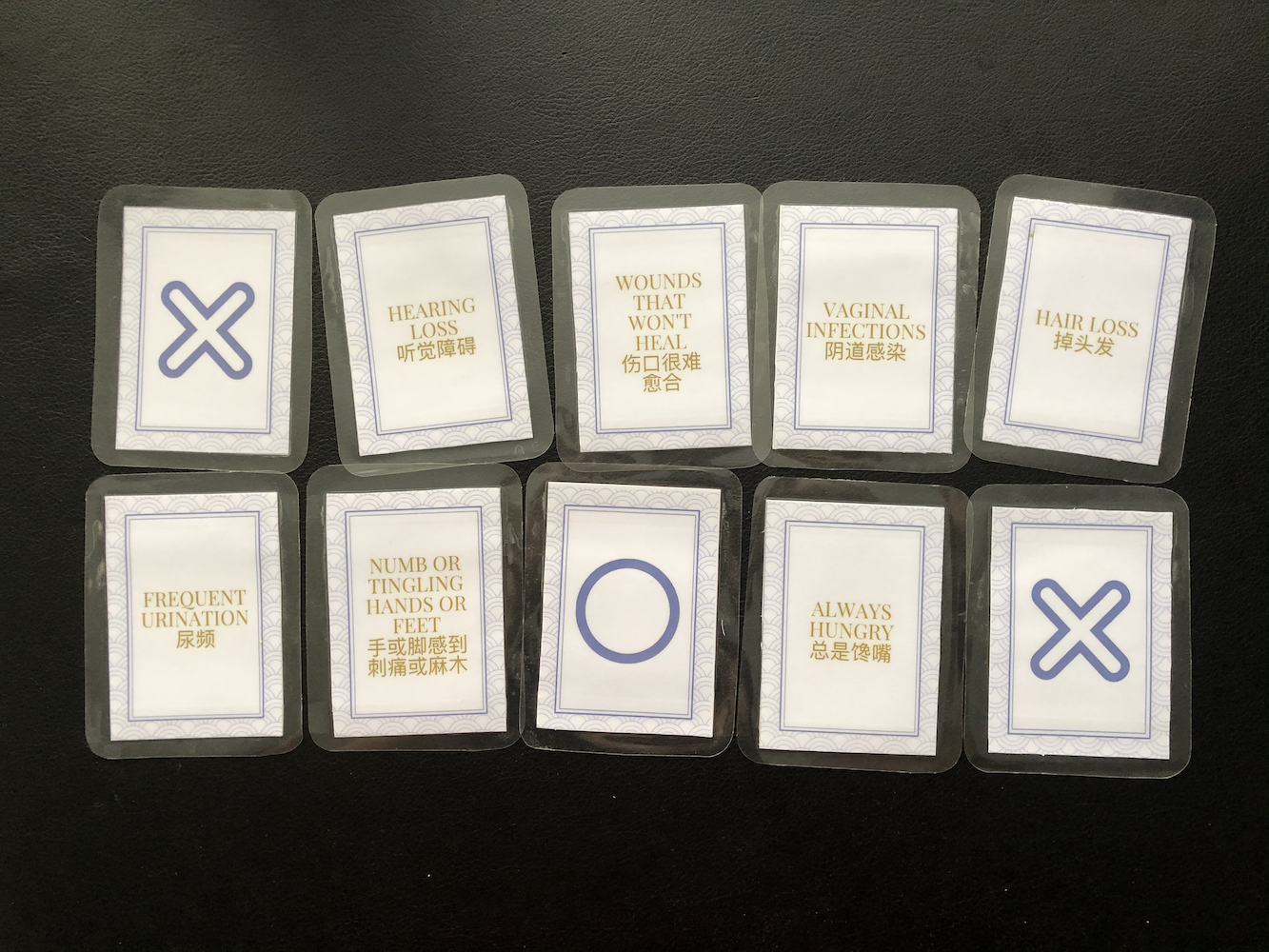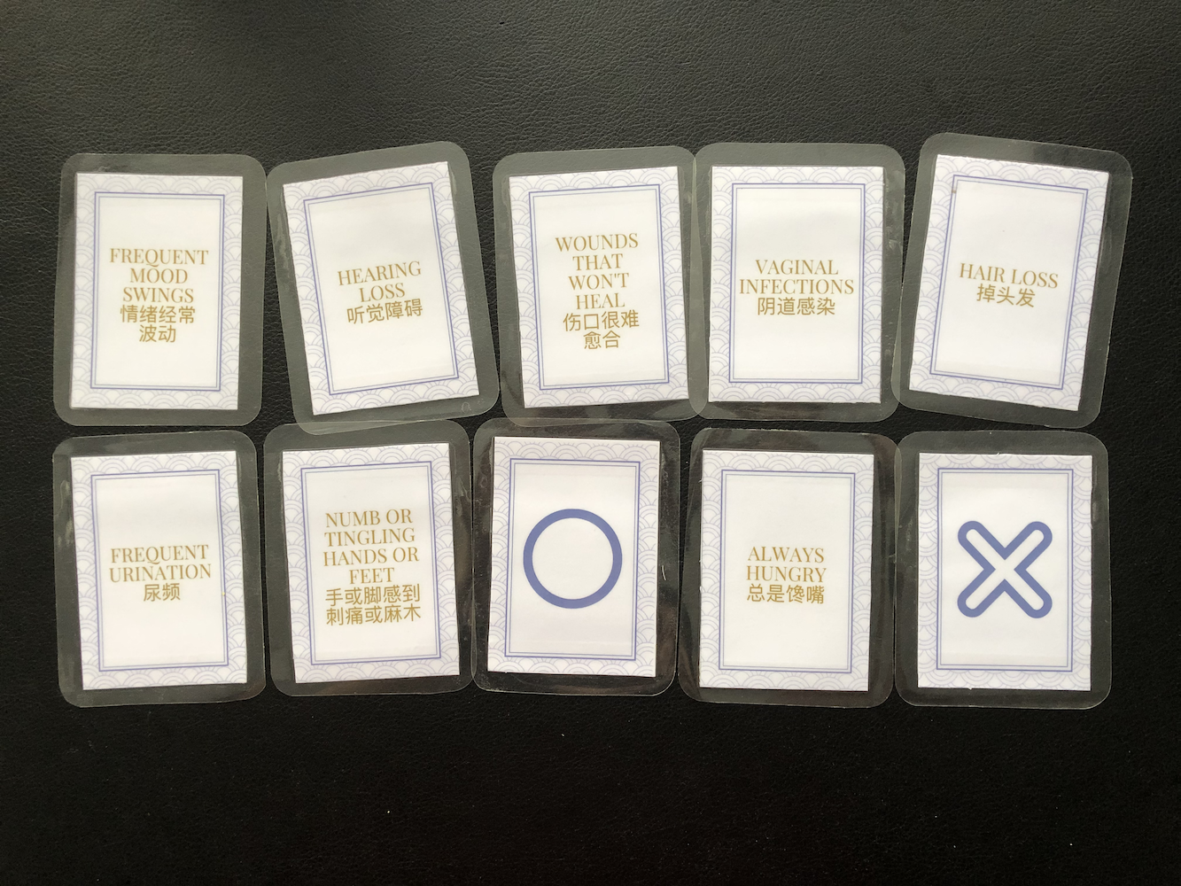 To help the public (especially the elderly), get more acquainted with the signs and symptoms of diabetes, I designed a deck of cards with the signs and symptoms in English and Chinese such that different demographics would be able to read them. On the back of the cards, there are circles and crosses that indicate which are correct or wrong.